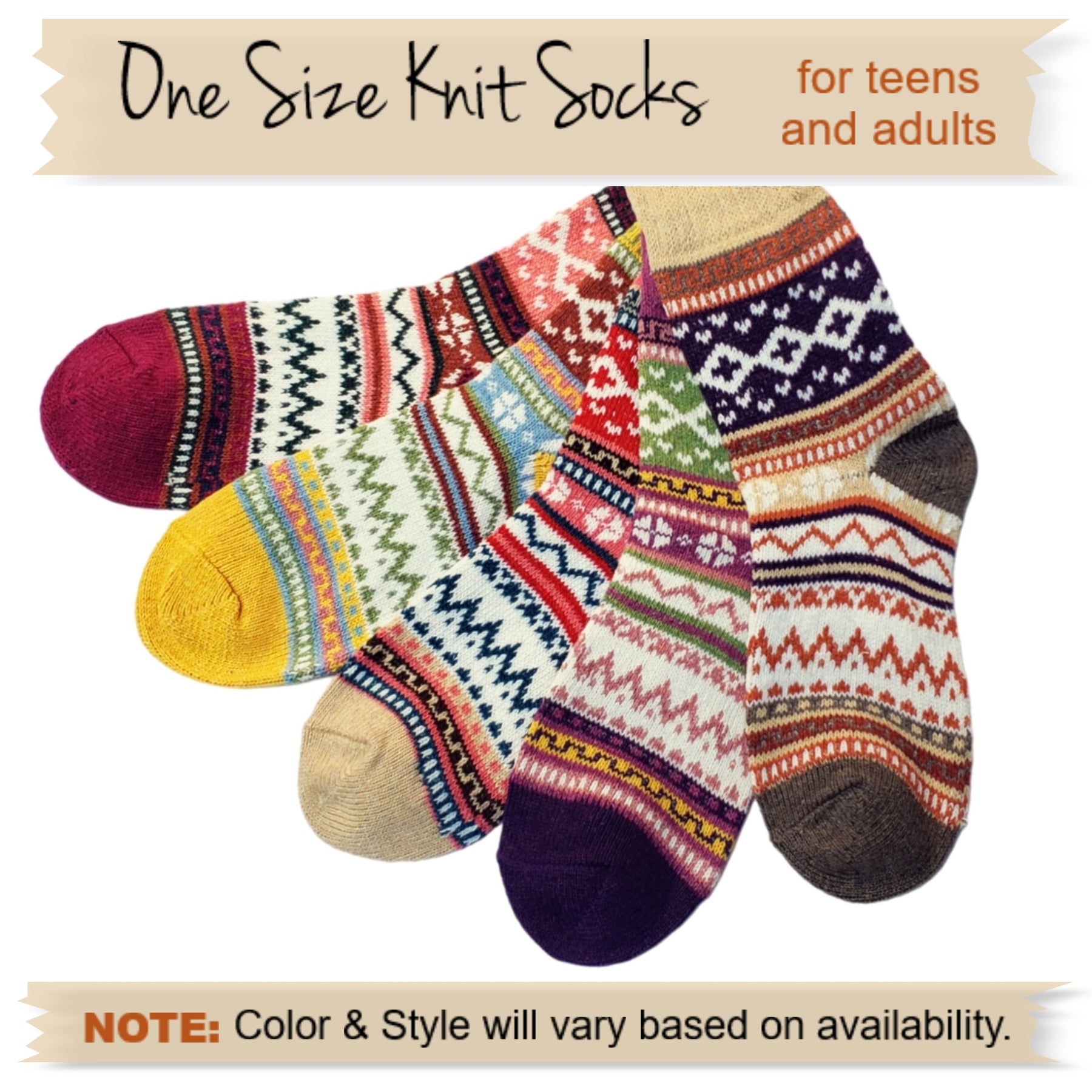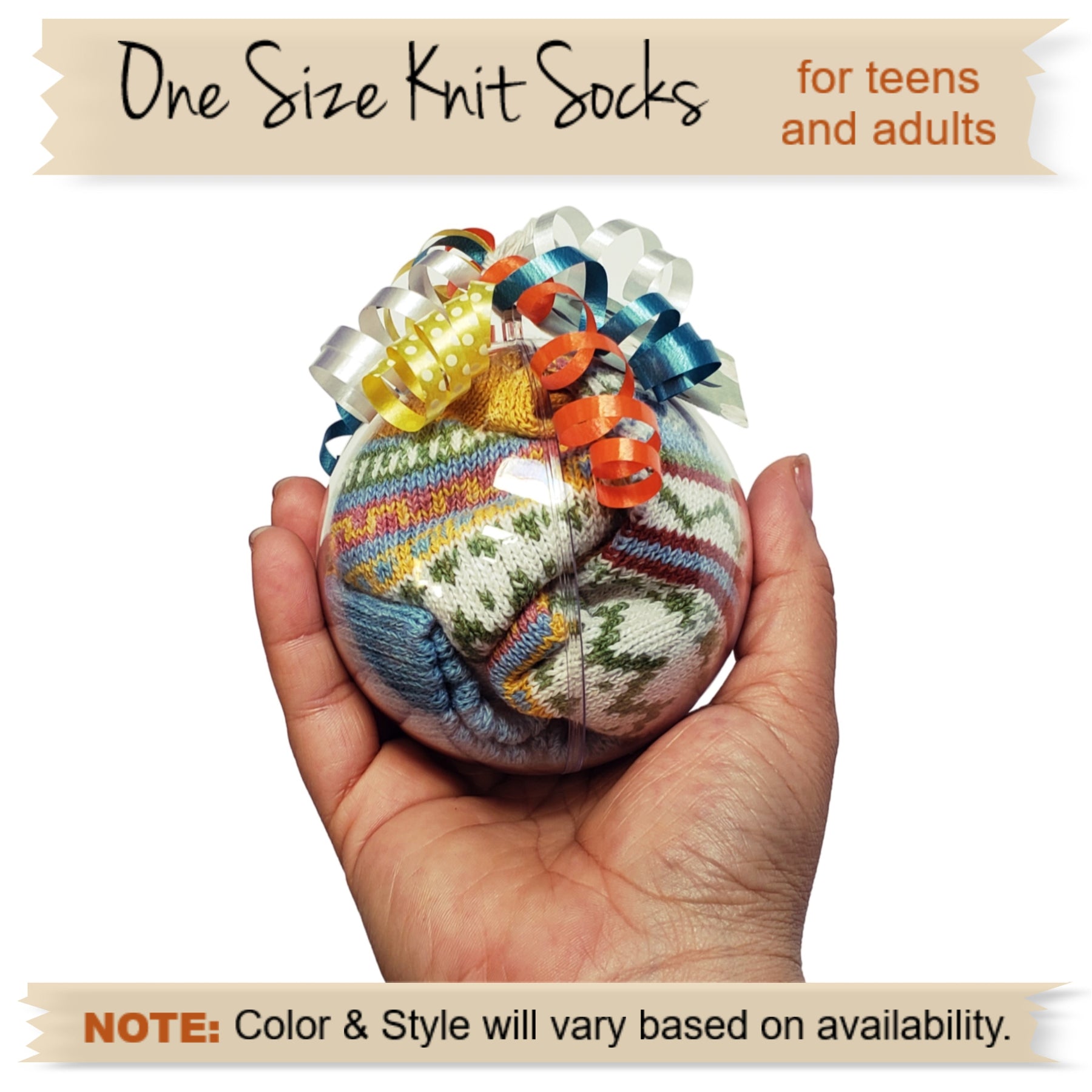 Each pair of wool socks is carefully nestled inside a clear ornament ball, complete with curly ribbons and a gift tag, all ready for gifting!