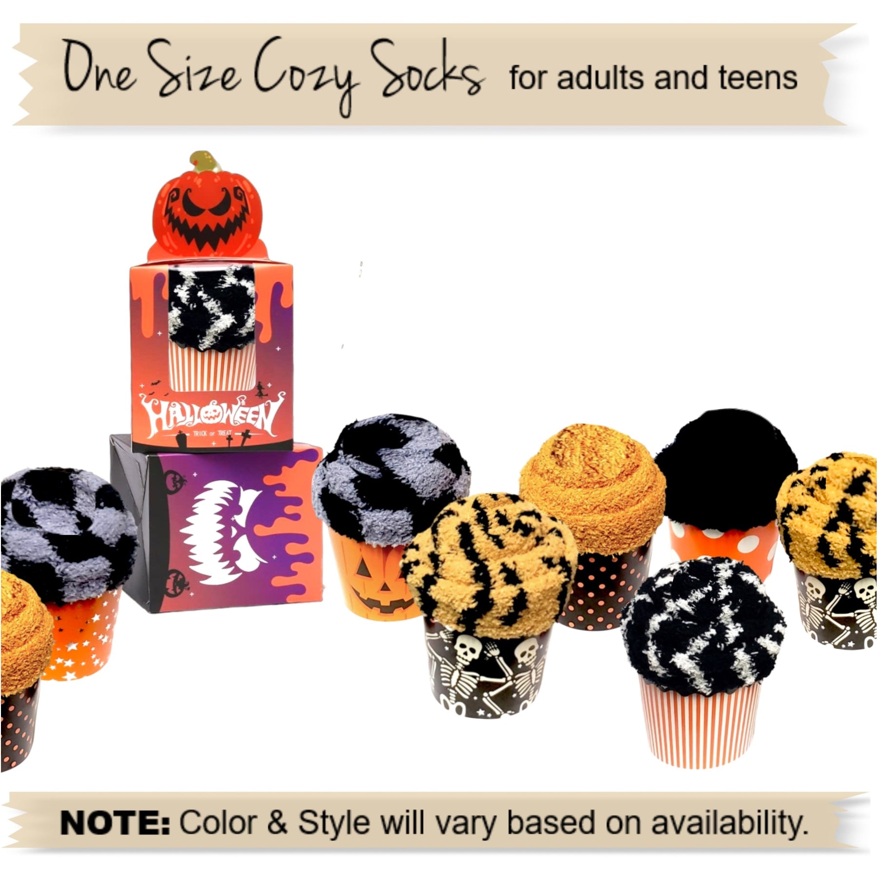 This Halloween gift box includes one pair of fuzzy socks styled like a cupcake and packaged in a pumpkin-themed box. It’s a thoughtful, ready-to-gift item for adults and teens.